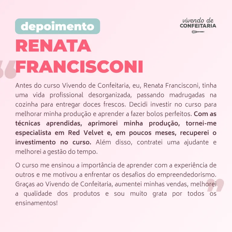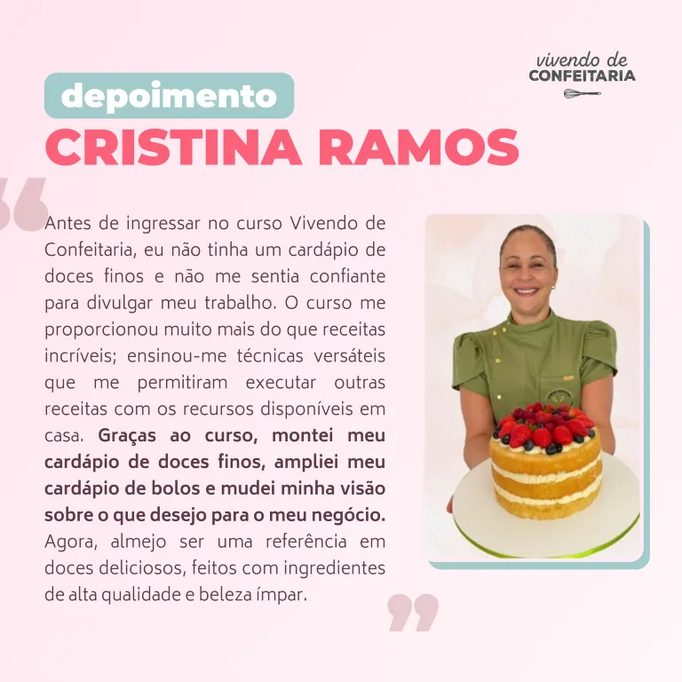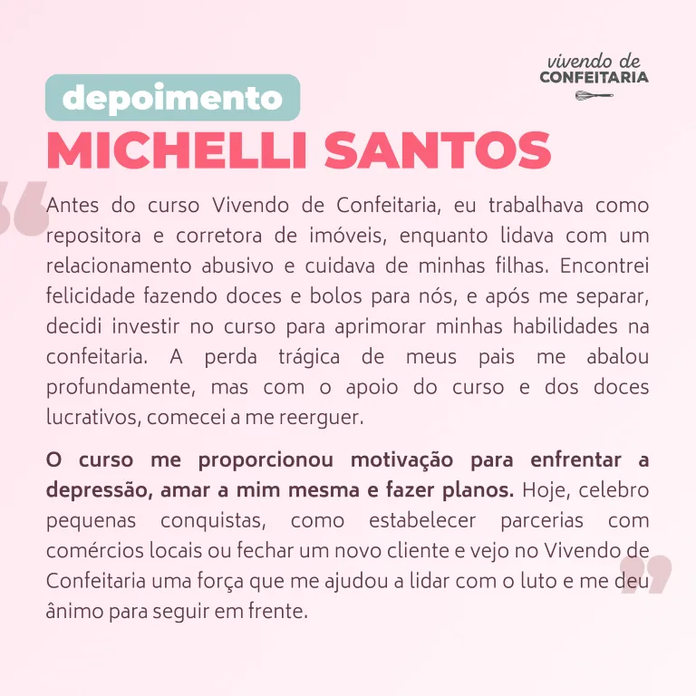 Percebi que muitas pessoas têm dificuldades em transformar a confeitaria em uma profissão rentável. Então, compartilhei minhas dicas e técnicas com seguidoras e vi famílias inteiras se estruturarem financeiramente.
